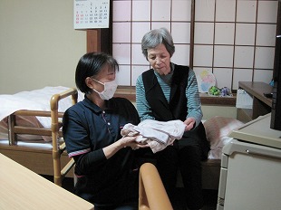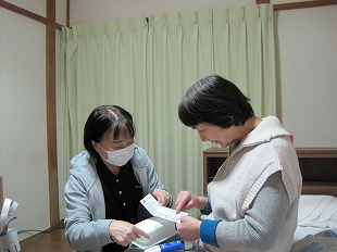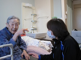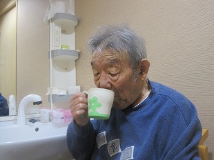 【入浴】 ![]() 入浴中はご家族のお話や思い出話をされ、リラックスして入浴して 頂いています。安全に安心して入浴ができるよう、見守りをおこない、入浴のお手伝いをさせて頂いています。 ![]() 入浴後は水分補給をおすすめしています。 「気持ち良かったです。ありがとうございました。」と声をかけて下さいます。 【口腔ケア】