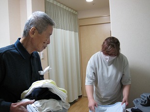 ![]() デイサービスでの入浴の準備を行い、不足しているものがないか一緒に確認しています。施設での生活やご自分の生い立ち等、世間話をされ、「聞いてもらって楽しかったわ。」と喜んでいただいています。 ![]() 施設に入られ、新たな生活が始まりました。わからないことが多くあり、心配事や不安な事をヘルパーに相談して下さいます。衣類の整理や環境整備をともに行いながら、お話を傾聴することで、安心して生活しておられます。
