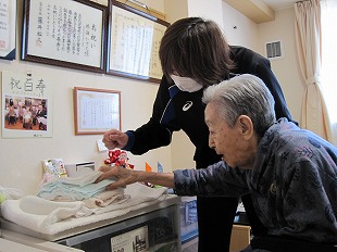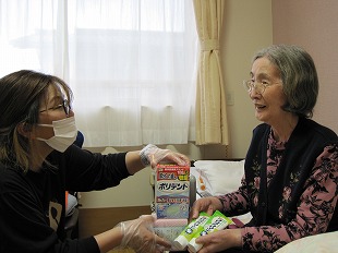 <お手玉探し> 雨の日はお手玉探しを行い施設内を散策しています。見つけられた時は達成感を得られ、喜んでおられました。 <買い物サービス> 在宅生活時から和菓子とお茶を楽しむ時間を大切にしておられた利用者様です。施設に入居されても、楽しみを持って生活して頂けるよう、買い物リストを一緒に作成し、ご希望の和菓子を購入して食べて頂きました。 <入浴準備> デイサービスの入浴の着替えを一緒に選んで頂き、用意しています。「このズボンが好きなの」「明日も暑いかしら」と好みの衣類を準備されていました。 <洗濯・物干し> 世間話をしながら一緒に物干しを行っています。「私、洗濯好きだから、毎日洗濯していたよ」と御自宅での生活を思い出し、いろいろ思い出話をされました。 <居室内清掃> 居室内の清掃後、ご本人様のお好きなチラシ折りを一緒に行いながら、悩まれたら助言しています。出来上がった作品を「あんた持って行かれ。また、作ってあげっちゃ」とご自身が作られた作品が、施設で使用し役に立っていることに満足感を得られています。 ![]() 2025・6月の思い出